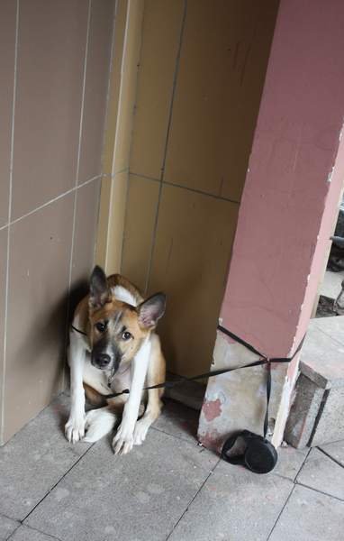 Был привязан к крыльцу приюта.